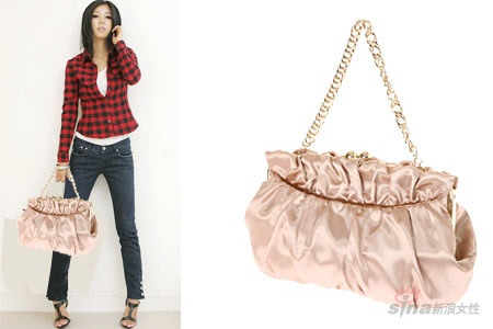 淡淡的粉色,少女般的甜美。丝绸包裹,自然褶皱款式设计的包包。跨上它充满优雅气质,同时金属链的设计,很前卫,它可是日本当季最HOT的包。