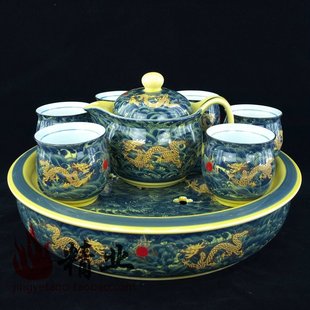 【配置】:一茶壶(壶内带不锈钢茶滤),六茶杯,一茶盘(可拆分式)。【规格】:茶壶高:11.5cm,口径:7.5cm。茶杯高:7cm,口径:7cm。茶盘高:7.5cm,直径:30.5cm。【等级】:特优级【材质】:骨质瓷【工艺】:浮雕龙描金,釉中彩【特点】:配有大号可拆分式茶盘,下层即可储水用,也可作茶洗用。喝茶方便、实用。摆设大气,华贵。【包装】:高档礼品盒(配精美手提袋)