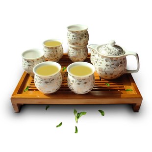 一茶壶(壶内带不锈钢滤网)六茶杯,一大陶瓷茶盘 本产品茶杯均为双层杯设计,隔热、不烫手,流畅的造型线条,符合人体工程学使用更舒适,配带大容量储水茶盘,储水排水方便实用!