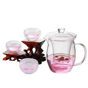 品名玻璃茶具5件套 Glass Tea Set · 5 Pieces材质耐热玻璃型号H8904认证标准-- 颜色透明包装方式彩印白盒尺寸茶壶:200×136×103mm;茶杯:¢65×32mm包装内附玻璃茶壶 X 1PC;玻璃双层杯 X 4PCS 容量茶壶:600ml 茶杯:50ml重量-- 产品特点 –采用耐高温玻璃手工吹制,每一个都独一无二; –组合套装让你与亲朋好友共同分享每一壶好茶。