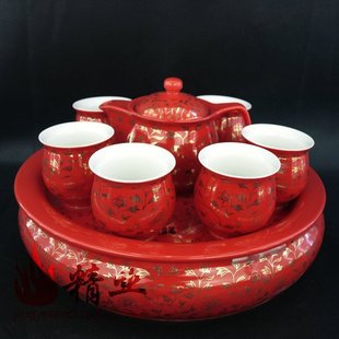【配置】:一茶壶(壶内带不锈钢茶滤),六茶杯,一茶盘(可拆分式)。【规格】:茶壶高:11.5cm,口径:7.5cm。茶杯高:7cm ,口径:7cm。茶盘高:7.5cm,直径:30.5cm。【等级】:特优级【材质】:骨质瓷【工艺】:中国红釉,描金【特点】:配有大号可拆分式茶盘,下层即可储水用,也可作茶洗用。喝茶方便、实用。摆设大气,华贵。【包装】:高档礼品盒(配精美手提袋)