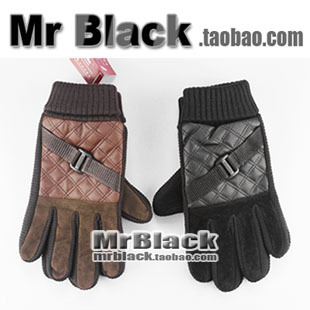 第六:2011秋冬翻边防风保暖内加绒毛线男士分指手套菱形格搭扣真皮黑棕