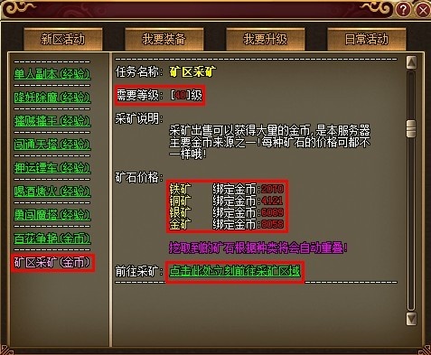 6711《武尊》中40级以上的玩家都可以通过挖矿才赚取金币。玩家点击查看游戏帮助,单击【我要升级】这个页签,即可看到【矿区采矿】这个活动,本活动全天候都可以进行,不限时间不限次数。玩家进入矿区,每15秒可以挖到一个矿石,每个矿石根据品质可以卖到2000到8000金币,如果玩家稍微肯花点时间,每天挖矿至少可以赚100万金币。