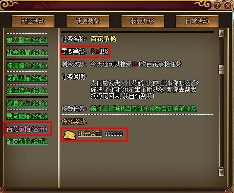 6711《武尊》百花仙子在【沙漠土城】向45级以上的玩家开放【百花争艳】这个日常任务,玩家每天可以领取十次任务,随即会被安排到各地观赏花海,顺便完成收集花种的任务。玩家在采集完花种后,可以将花种送至百花仙子处,这样就完成了百花争艳的任务,玩家每次完成任务,都可以获得百花仙子奖励的10万金币,十次下来,一百万金币即收入囊中。